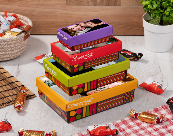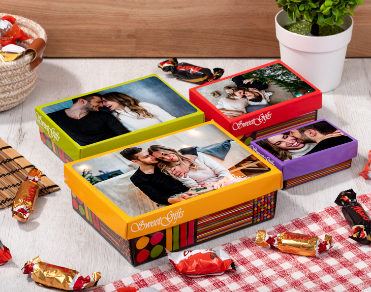 Si hay algo que puede endulzar el día de cualquier persona es el chocolate. Deja de buscar porque tenemos el regalo perfecto para la persona más golosa del mundo y es esta torre de chocolates personalizada. Un detallito de lo más original y diferente con el que conseguirás conquistar tanto el corazón como el paladar de esa persona que tanto quieres. Seguro que no se espera un regalo tan especial y dulce como este. ¡Es lo más! Imagínate la ilusión que le hará a cualquier persona recibir esta original torre llena de chocolatinas. No hay mejor regalo que este para dejar sin palabras a alguien en una fecha tan importante como su cumple, vuestro aniversario o el amigo invisible. Además, esta torre está formada por cuatro cajas de colores con tamaños diferentes que irán rellenas de sus chocolatinas favoritas. ¡No hay regalo mejor! ¡Y lo más importante! No te olvides de personalizar las cuatro cajas con el diseño que más te guste. Añade el producto al carrito y entra en el área de personalización. Cada caja tendrá su propia plantilla, porque lo que podrás añadir a cada una el diseño que tú quieras, desde imágenes hasta texto o ambas. ¡Deja volar tu imaginación! Nosotros nos encargamos de que todos los diseños queden perfecto sen las tapas de estas cajas. ¡No habrá regalo más dulce! Medidas de las cajas: - Caja morada: 9,5 x 6 x 3 cm. - Caja roja: 12 x 8 x 3,5 cm. - Caja verde: 14,5 x 10,5 x 4 cm. - Caja amarilla: 17,5 x 12,5 x 4,5 cm. Importante:Las chocolatinas pueden variar según stock. Importante: si puedes tener reacción a cualquier tipo de alérgenos, puedes escribirnos para consultar si hay alguna opción alternativa.