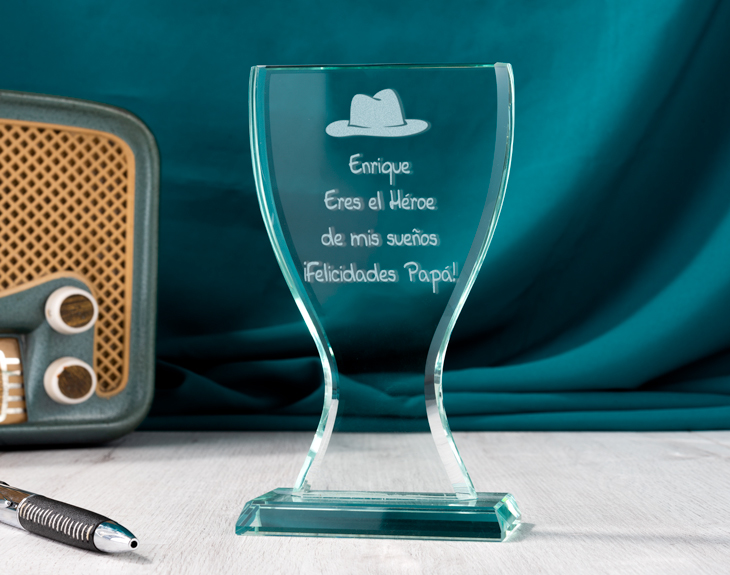 Si tu papá es un héroe, se merece un trofeo que lo acredite. Por eso, nosotros te presentamos este trofeo de cristal personalizado que será perfecto para el día del padre, para el cumpleaños de tu papá y para cualquier otra fecha señalada. Importante: el sombrero está incluido en el diseño, pero si solo quieres recibir el trofeo con la frase, indícalo en observaciones. Te entregaremos el producto como te gusta.