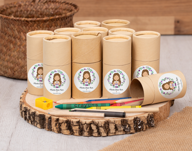 Una de las actividades que más hacen los niños cuando son pequeños es pintar. Se pueden pasar hora y horas, dibujando o simplemente coloreando dibujos que ya están hechos. Además, pintar viene muy bien para desarrollar su imaginación. Por eso, este tubo de cartón con pinturas personalizado se puede convertir en un regalo muy especial. Ahora que se acerca la época de las comuniones y al más peque de la casa le toca este año, nuestro tubo de pinturas se puede convertir en un recuerdo para regalar a los invitados de la ceremonia. Lo mejor es que es personalizable. Podrás escribir el nombre del protagonista de este día y el lugar de la celebración. ¡Quedará genial! Personalizar este tubo con pinturillas es muy sencillo. El primer paso a seguir consiste en añadir el producto al carrito y entrar al área de personalización. Una vez ahí, ya puedes escribir el nombre que tú quieras. Pronto estará perfecto y listo para regalar. ¡Será un original regalo para comuniones! Medidas aproximadas: 10 x 4,5 cm.