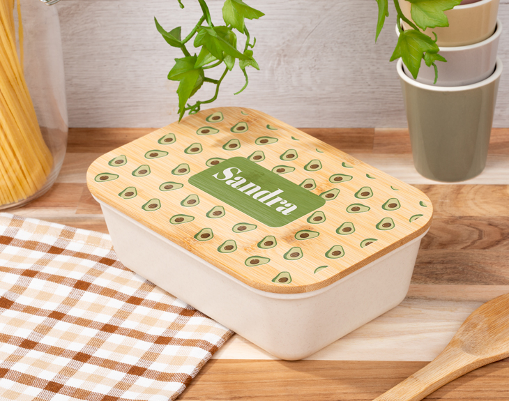 Sorprende a esa persona que no puede vivir sin los aguacates con nuestra tartera personalizada hecha de plástico y bambú. Esta fiambrera de color beige y tapa de madera, es perfecta para llevar tu comida y disfrutarla cuando quieras. Además, incluye una cinta elástica para evitar que la tapa se abra y tu comida esté siempre a salvo. ¡Lo tiene todo!