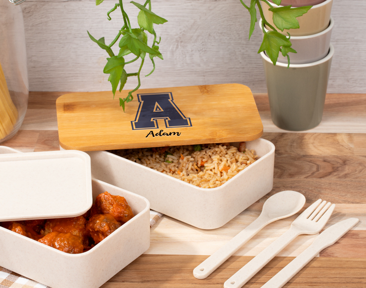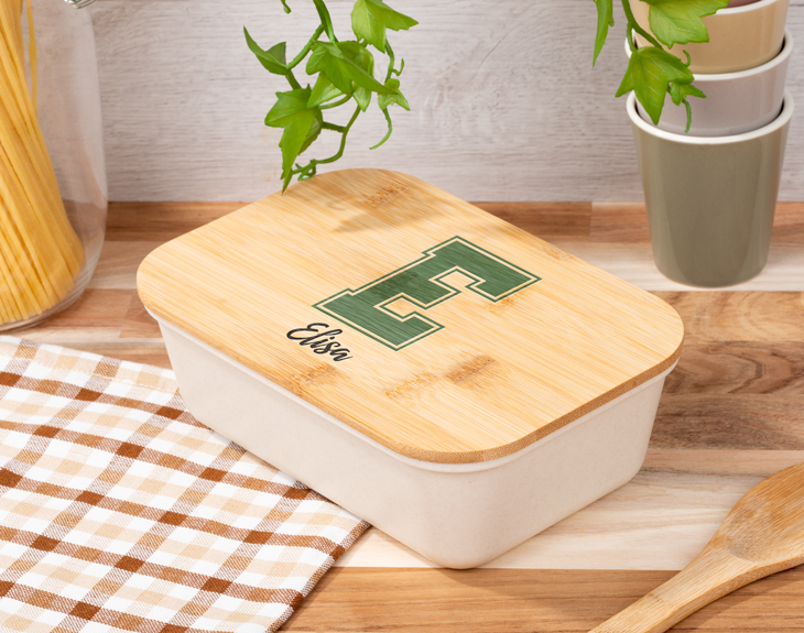 El trabajo o la universidad a veces nos obligan a comer fuera de casa y eso significa tener que preparar la comida cada día para llevártela. Si a ti también te da pereza cocinar cada semana, queremos alegrarte un poco los días con este tupper bento personalizado en el que podrás llevar toda tu comida de la forma más guay. Y es que sabemos que esta lunchera tan elegante y práctica se convertirá en tu utensilio favorito cada vez que tengas que comer en la ofi o donde sea. ¡Es ideal! Esta original tartera personalizada también puede ser el regalo perfecto para sorprender a esa persona que siempre come fuera de casa, ya sea por trabajo o por ocio. Esta fiambrera hecha de plástico y bambú es ideal para llevarla a cualquier sitio y comer siempre bien. De color beige y tapa de madera, incluye una cinta elástica para sujetar la taa y evitar que se abra y se salga la comida. ¡Lo tiene todo! Lo mejor es que podrás elegir la opción que más te guste: la fiambrera individual de 1 litro de capacidad o el táper doble con dos recipientes de 700 mililitros, cubiertos y un separador de comida. Elige la lunchera que más te guste y se adapte a tus necesidades y personalízala como tú quieras. Personalizar esta caja para almuerzoes súper fácil. Primero elige una de las dos opciones, añádela al carrito y entra en el área de personalización. Ahí, podrás elegir la inicial que quieras de nuestra preciosa familia 'Alfabeto College' y después poner también el nombre para terminar este diseño. Nosotros nos encargamos del resto. ¡Tu tupper estará listo para disfrutar! Apto para microondas y lavavajillas. Material: PP (polipropileno). Libre de BPA. Información del tupper individual: - Medidas: 20 x 14 x 7 cm. - Capacidad: 1 litro. - No incluye cubiertos. Información del tupper doble: - Medidas: 18 x 10,6 x 9 cm (dos tuppers) / 18 x 10,6 x 5 cm (un tupper) - Capacidad: 700 mililitros cada recipiente. - Incluye cubiertos (cuchara, tenedor y cuchillo) Medidas de los cubiertos: 15 cm.