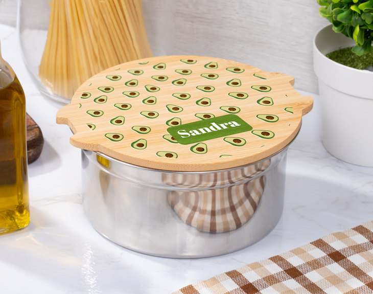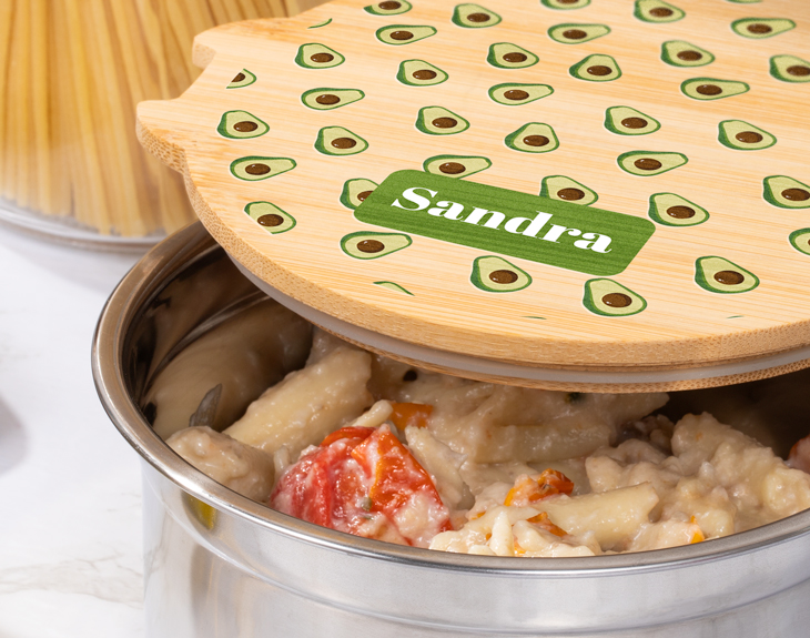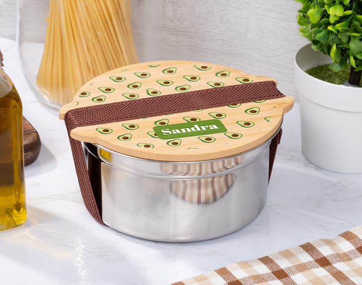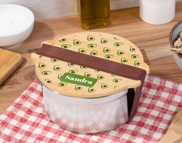 ¿Eres un fanático de los aguacates? ¿Te imaginas disfrutar de ellos en cualquier lugar al que vayas? Si eres de esos que quiere disfrutar de la comida incluso cuando está en el trabajo, este tupper personalizado está hecho para ti. ¡Podrás llevar todos tus platos favoritos en esta fiambrera tan original! Esta tartera personalizada con diseño de aguacates Está hecha a la perfección para esas personas que adoran esta fruta por encima de todo. Podrás disfrutar de esta lonchera (o "lunchera") en cualquier lugar, hecha de acero inoxidable y con tapa de bambú, dando un estilo de lo más elegante a todas tus comidas semanales. La tapa cuenta con una medida de 15 centímetros de diámetro y la base del táper bento es de 13 centímetros. ¡Y contará con una capacidad de 800 mililitros! A la hora de personalizar esta caja para almuerzo tan característica y hecha para los fans de los aguacates, solo tendrás que añadir el producto al carrito y entrar en el área de personalización para diseñar tu propio táper. Solo tendrás que entrar en el diseñador y clicar sobre el cuadro de texto, sobre el que podrás escribir el nombre que quieras. ¡Este diseño quedará plasmado en la tapa! Importante: este recipiente no es apto para microondas. Material: acero inoxidable (fiambrera), bambú (tapa). Medidas: 15 x 13 x 7,5 centímetros. Capacidad: 800 mililitros.