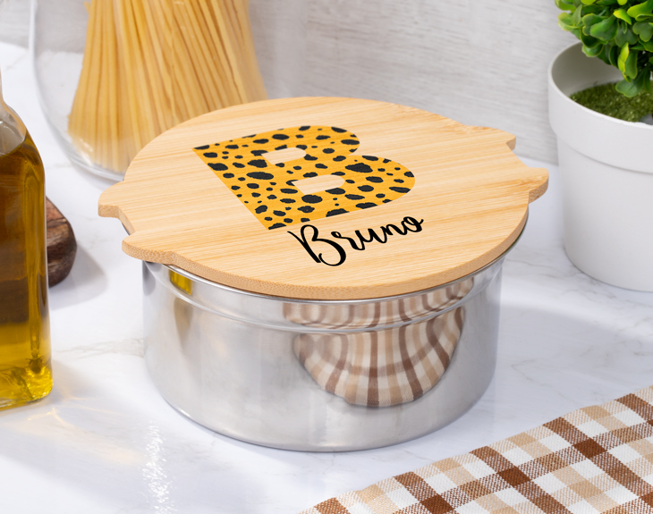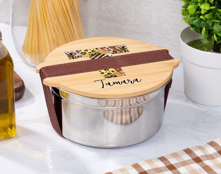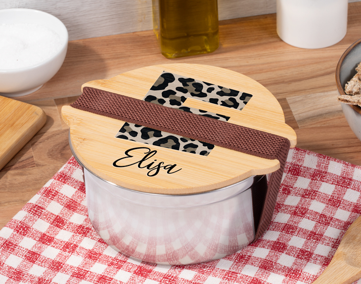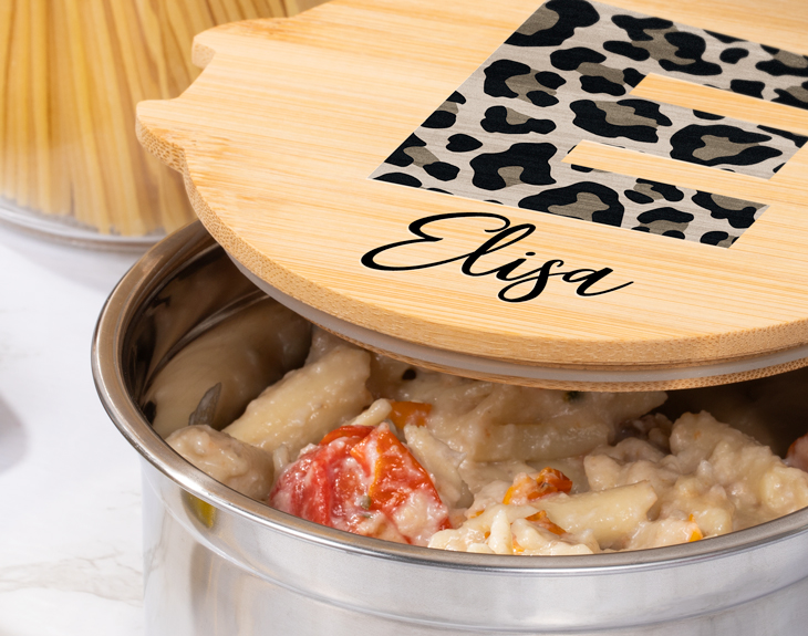 Comer fuera de casa es algo recurrente entre los estudiantes y las personas que trabajan en una oficina. Aunque es cierto que muchas veces nos da pereza prepararnos la comida y llevarla a cuestas todos los días. Por eso, como queremos que tus comidas sean mucho más divertidas, necesitas hacerte con tu propio tupper personalizado para disfrutar de tus platos favoritos al máximo. Saca tu lado más salvaje con esta lunchera 'Animal Print' y sé el más guay entre tus compis. ¡Todos querrán tener uno igual! Sorprende a esa persona tan especial con nuestra original tartera personalizada fabricada con acero inoxidable y una tapa de bambú que le da un toque de lo más elegante. Gracias a su material, podrás mantener tu comida fría o caliente durante mucho más tiempo y disfrutarla donde quieras. Además, incluye una cinta elástica para sujetar la tapa y evitar que se salga el contenido. Así podrás llevarlo en la mochila, en el bolso o donde quieras. ¡Es el regalo perfecto! Pero sin duda la mejor parte es poder personalizar esta caja para almuerzo o táper porque es muy fácil. Primero añade el producto al carrito y entra en el área de personalización. Una vez ahí, podrás elegir la inicial con el estampado animal que más te guste y escribir tu nombre debajo. Así todo el mundo sabrá que el tupper más guay del mundo es tuyo. ¡Será un regalo único y diferente! Importante: este recipiente no es apto para microondas. Material: acero inoxidable (fiambrera), bambú (tapa). Medidas: 15 x 13 x 7,5 centímetros. Capacidad: 800 mililitros.