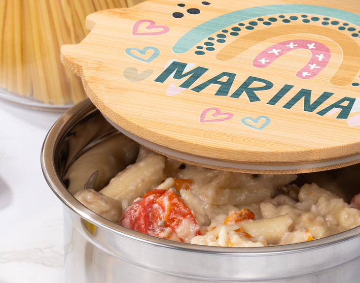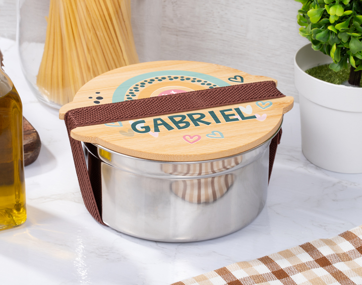 Si comer fuera de casa forma parte de tu rutina y todos los días tienes que llevarte la comida al trabajo, a la universidad o a una excursión del colegio... Este tupper bento personalizado es el mejor aliado para disfrutar de tus platos favoritos todos los días y hacer que la rutina sea un poco más divertida. Hazte con esta fiambrera tan adorable que conquistará el corazoncito tanto de mayores como de pequeños. ¡Es ideal! Sorprende a esa persona tan especial con nuestra original tartera con diseño 'Arcoíris Pastel' y haz el regalo más guay del mundo. Esta lunchera está hecha de acero inoxidable y su tapa de bambú, que le aporta un estilo de lo más elegante. La tapa cuenta con una medida de 15 centímetros de diámetro y la base del táper es de 13 centímetros. ¡Y tiene capacidad para 800 mililitros! A la hora de personalizar esta caja para almuerzo tan característica y hecha para todos, solo tendrás que añadir el producto al carrito y entrar en el área de personalización para diseñar tu propio utensilio. Solo tendrás que entrar en el diseñador y añadir el nombre que quieras. ¡Este diseño quedará plasmado en la tapa! Importante: este recipiente no es apto para microondas. Material: acero inoxidable (fiambrera), bambú (tapa). Medidas: 15 x 13 x 7,5 centímetros. Capacidad: 800 mililitros.