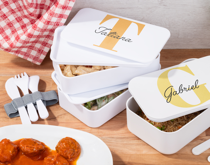 Todos sabemos que los días en el trabajo o en clase son muy complicados. ¡Por eso tenemos que aprovechar cada segundo de nuestra rutina para hacerla lo más especial posible! Este tupper bento personalizado será la clave para dejar con la boca abierta a todos tus compañeros cuando llegue la hora de comer. ¡Todos querrán un táper con cinta de seguridad y cubiertos incluidos! Esta tartera personalizada con diseño de inicial es perfecta para llevarla a cualquier parte a lo largo del día. Podrás elegir entre dos tamaños disponibles: individual o doble. El individual cuenta con capacidad de 1 litro y está hecho de PLA y libre de BPA, lo cual hace que sea sostenible. Por otro lado, el doble cuenta con una capacidad de 1,4 litros entre las dos fiambreras, también incluye cubiertos y, además, está hecho de polipropileno libre de BPA. ¡Ambos cuentan con una medida aproximada de 19 centímetros de largo por 11 de ancho! Personalizar este táper es muy fácil. ¡Será el regalo original más útil y sorprendente que le puedas hacer a esa persona a la que le encanta disfrutar de la comida! Solo tendrás que añadir la sandwichera que quieras al pedido y entrar en el área de personalización, donde podrás personalizar la tapa clicando sobre los cuadros de texto que encuentres en la plantilla del producto. ¡Una caja para el almuerzo de lo más elegante! Información del tupper individual: - Medidas: 19 x 11,5 x 6,5 cm. - Capacidad: 1 litro. - Incluye cubiertos (cuchara, tenedor y cuchillo). Material del tupper individual: PLA (ácido poliláctico). Libre de BPA. Materiales sostenibles. Información del tupper doble: - Medidas: 18,5 x 10,5 x 9 cm (dos tuppers) / 18,5 x 10,5 x 4,5 cm (un tupper) - Capacidad: 1,4 litros (entre ambos). - Incluye cubiertos (cuchara, tenedor y cuchillo) - Anti bacterial. Material del tupper doble: PP (polipropileno). Libre de BPA. Medidas de los cubiertos: 13,5 cm.