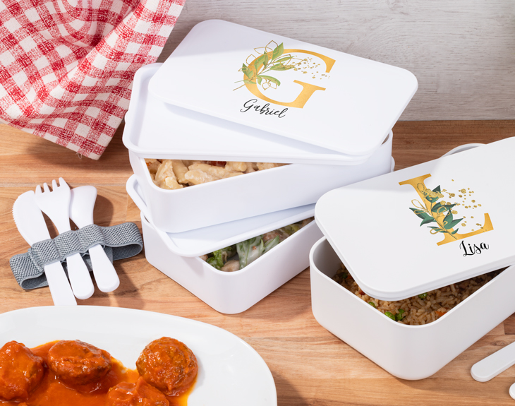 Comer fuera de casa todos los días: o lo amas o lo odias. Y es que prepararte la comida durante toda la semana para llevártela al trabajo o a la universidad puede ser algo tedioso. Por eso, como queremos que ames comer en el trabajo o la uni, necesitas tener tu propio tupper bento personalizado. Añade tu inicial y nombre para que esta fiambrera sea única y seas la persona más guay de todo el comedor. ¡Todos querrán tener un tupper como el tuyo! Date un capricho o sorprende a esa persona tan especial con un regalo único: ¡nuestra original tartera personalizada! Disfruta de tu comida al máximo y elige que táper te gusta más: el individual que está hecho de plástico PLA, un material sostenible con el que ayudarás al planeta reutilizándolo todos los días; o el doble que incluye dos recipientes y está hecho de PP. ¡Ambos están libres de BPA, con cubiertos incluidos y una cinta elástica para asegurar el contenido! Pero espera porque todavía queda lo mejor y es personalizar esta caja para el almuerzo. Solo tendrás que añadir el producto al carrito y entrar en el área de personalización, donde encontrarás el diseñador para elegir la inicial que más te guste de nuestra familia 'Letras Botánicas' y después podrás escribir tu nombre debajo. Nosotros nos encargamos de que quede perfecto y listo para usar. ¡Será el mejor regalo del mundo! Información del tupper individual: - Medidas: 19 x 11,5 x 6,5 cm. - Capacidad: 1 litro. - Incluye cubiertos (cuchara, tenedor y cuchillo). Material del tupper individual: PLA (ácido poliláctico). Libre de BPA. Materiales sostenibles. Información del tupper doble: - Medidas: 18,5 x 10,5 x 9 cm (dos tuppers) / 18,5 x 10,5 x 4,5 cm (un tupper) - Capacidad: 1,4 litros (entre ambos). - Incluye cubiertos (cuchara, tenedor y cuchillo) - Anti bacterial. Material del tupper doble: PP (polipropileno). Libre de BPA. Medidas de los cubiertos: 13,5 cm.