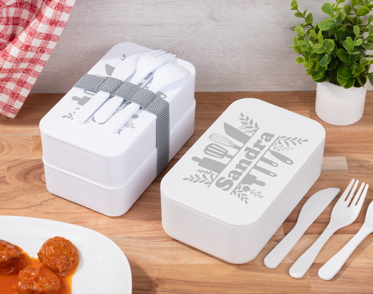 Si eres de esas personas que normalmente tiene que comer fuera de su casa, sin duda, necesitas tener tu propio tupper personalizado. Dinos el nombre que tú quieras y nosotros lo grabamos en la superficie. Es un regalo original y práctico para aquellas personas que se pasan el día sin parar, de un lado para otro, y que disfrutan de la comida casera estén donde estén y en cualquier situación. ¡Además tienes los cubiertos incluidos! Con su diseño práctico te permitirá guardar tus comidas y llevártelas contigo a dondequiera que vayas. Ya sea para comer en la oficina, en la universidad, en una excursión, en un picnic… este tupper personalizado se convertirá en tu nuevo compañero inseparable que hará tus comidas un poco más especiales. ¿Cómo se personaliza este tupper? Primero, tienes que elegir una de las dos opciones, añadirlas al carrito y entrar al área de personalización. Ahí, podrás poner el nombre que tú quieras. ¡Y tu tupper pronto estará listo para disfrutar! Información del tupper individual: - Medidas: 19 x 11,5 x 6,5 cm. - Capacidad: 1 litro. - Incluye cubiertos (cuchara, tenedor y cuchillo). Material del tupper individual: PLA (ácido poliláctico). Libre de BPA. Materiales sostenibles. Información del tupper doble: - Medidas: 18,5 x 10,5 x 9 cm (dos tuppers) / 18,5 x 10,5 x 4,5 cm (un tupper) - Capacidad: 1,4 litros (entre ambos). - Incluye cubiertos (cuchara, tenedor y cuchillo) - Anti bacterial. Material del tupper doble: PP (polipropileno). Libre de BPA. Medidas de los cubiertos: 13,5 cm.