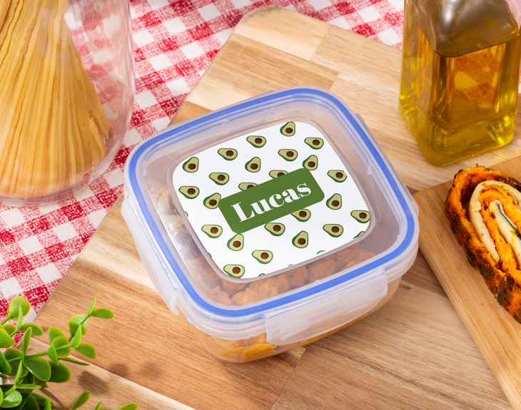 Seguro que en casa tienes un montón de recipientes para guardar tus snacks favoritos o la comida que cada día te llevas al trabajo. Pero si te gustan las cosas especiales y diferentes, este tupper personalizado es lo que necesitas para ser la envidia de todos allá donde vayas. Su tapa está personalizada con una pegatina súper guay que puede llevar tu nombre o el de quien tú quieras. Este original utensilio se convertirá en tu mejor aliado para el día a día. Porque este táper fabricado con plástico transparente es perfecto para guardar en él todo lo que quieras: ese snack que disfrutas siempre por la mañana o la comida que te llevas cada día al trabajo. Además, tiene el tamaño ideal para llevarlo y guardarlo en el bolso o en la mochila y su contenido no se saldrá gracias a las cuatro pestañas que lo mantienen cerrado. ¡Es lo más! Y toca el momento más guay que es personalizar este tupper para que sea único. Añade el producto al carrito y entra en el área de personalización. Si eres fan de los aguacates, este diseño te va a encantar. Complétalo con el nombre que quieras y nosotros nos encargamos de que quede perfecto y listo para disfrutarlo. ¡Será el mejor regalo del mundo! Importante: el color y la forma del tupper pueden variar según stock. Material: plástico transparente. Medidas: 12,5 x 12,5 x 6,5 cm. Capacidad: 500 ml.