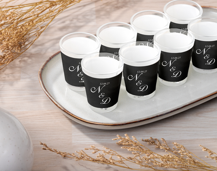 • Vasos de chupito personalizados. • Tarjeta recordatoria.