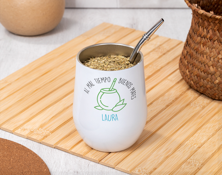 A veces, cuando te levantas en día gris y frío, lo único que lo puede arreglar es tu infusión de mate calentita mientras te acurrucas en el sofá. Si es tu caso, con nuestro vaso de mate blanco personalizado Al mal tiempo podrás sobrellevar los días de mal clima con una sonrisa. ¡La mejor de las rutinas para levantar el ánimo es disfrutar de tu infusión favorita con tu vaso personalizado! El mate es una bebida muy popular en todo el mundo y sus grandes propiedades son solo una pequeña parte de su éxito. Lo cierto es que disfrutar de un vaso calentito de mate mientras te relajas en tu hogar, es un auténtico placer, capaz de levantar hasta el ánimo más decaído. Nuestros vasos se fabrican en acero inoxidable y cuentan con doble capa para conservar mejor el calor de la infusión. Externamente, son preciosos, gracias a su revestimiento de color blanco y a su original diseño. Además, al hacer el pedido, tienes la opción de comprar el vaso solo o incluir la bombilla para que puedas tener el pack completo. Pero, sin duda, lo que convierte este vaso en un regalo original es su precioso diseño personalizado. Para su personalización, incluimos un dibujo de un vasito de mate sobre el que figura la frase que animará tus días: “Al mal tiempo, buenos mates”. Durante el proceso de pedido, podrás completar este diseño tan especial con tu nombre o el nombre de la persona a la que quieres sorprender. Nosotros trasladaremos el diseño directamente a la superficie del vaso para conseguir un regalo único y especial. Este vaso es ideal para disfrutar de tu infusión de mate favorita pero también será una opción genial cuando desees sorprender a un ser querido al que le guste esta infusión. Si se acerca su cumpleaños o un día especial para esa persona, diseña este vaso con su nombre y tendrás un regalo que no olvidará nunca. Altura: 12 centímetros. Base: 5,5 centímetros. Borde: 8 centímetros. Capacidad: 360 mililitros. Material: acero inoxidable. Color: blanco. Medidas de la tapa: 7,5 x 8 centímetros. Incluye doble pared. Importante: incluye tapa transparente con boquilla.