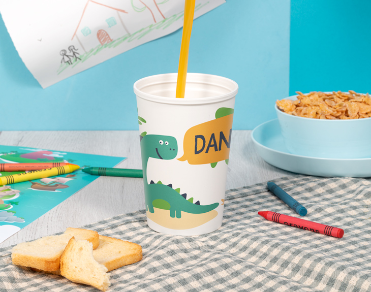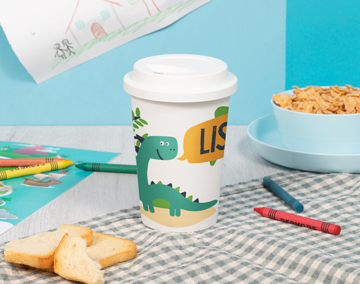 Los más pequeños de la casa también necesitan un buen desayuno para estar mucho más atento durante las clases de matemáticas. ¿Por qué no tomar su Cola-Cao mañanero de una forma tan original como comprometida? Este vaso de cerámica personalizado es perfecto para esos días de rutina en los que se llega tarde al colegio. Si vuestro hijo está completamente obsesionado con 'Jurassic Park' y todo lo referente a los dinosaurios, este vaso para llevar con diseño de dinosaurio es el producto que estabas buscando. ¡Vuestro niño o niña no querrá desayunar en otro recipiente! Además, incluye una funda aislante de silicona a juego con la tapa para que puedas beber estés donde estés y sin derramar nada. ¡Lo único que quedará será la personalización! Añade el producto al carrito y entra en el área de diseño para crear tu propio vaso con nombre. En el interior del diseñador encontrarás la plantilla del producto, en la que tendrás que clicar sobre el cuadro de texto para escribir el nombre que quieras. ¡Tú mismo diseñarás este regalazo! Medidas: - Altura: 13,5 cm. - Ancho: 9 cm diámetro en la parte superior y 5,5 cm de diámetro en la base. - Capacidad: 400 ml.