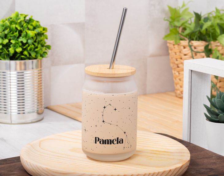 En el mundo existen muchos amantes del café, pero seguro que ninguno de ellos tiene un vaso con tapa y pajita personalizado tan precioso como este. Es perfecto para prepararte tu café o bebida favorita, depositarla en él y llevarlo donde quieras. Será tu mejor aliado en el día a día porque es lo más. Gracias a su tapa con pajita, este original vasito es ideal para llevarlo a la oficina, cuando vayas de viaje o donde tú quieras. Está fabricado en cristal y su pajita es de acero inoxidable, por lo que podrás reutlizarlo tantas veces como quieras. Aunque lo que nos ha enamorado de este vaso, es su diseño de constelaciones. ¡Es precioso! Seguro que ya estás pensando cómo puedes personalizar este vaso. Es tan fácil como acceder a nuestro diseñador, elegir la constelación que más te guste y añadir el nombre que quieras. ¡Tendrás el regalo más bonito y útil del mundo! Características: - Medidas: 12,5 cm x 7,7 cm - Capacidad: 400 ml - Material: cristal mate. - Pajita: acero inoxidable.