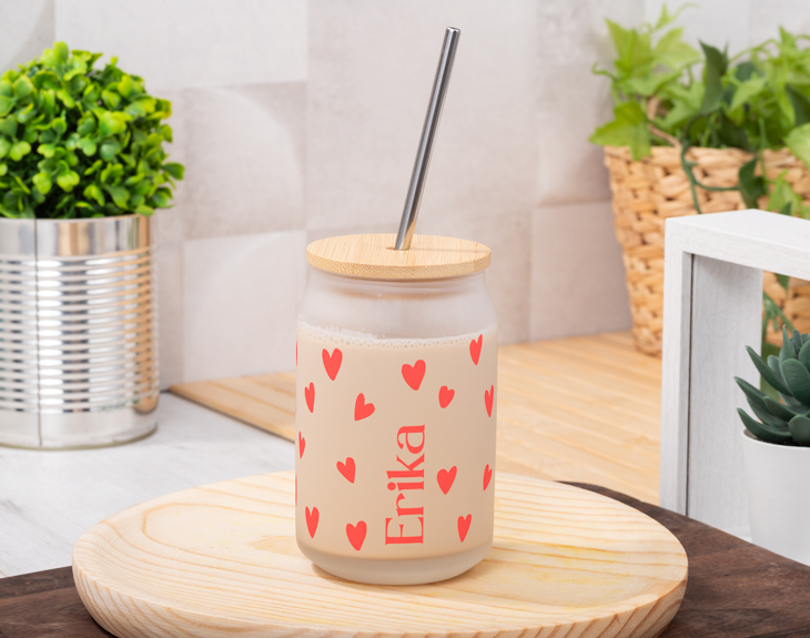 ¿Qué es lo primero que haces cuando te despiertas? Seguro que tienes muchas cosas que hacer, pero si hay algo que no se te puede olvidar es tomarte un buen café cada mañana. A partir de ahora podrás hacerlo con este precioso vaso con tapa y pajita personalizado. Es el accesorio ideal para disfrutar de tu bebida favorita cada día, y no solo en casa, porque podrás llevarlo donde quieras. ¡Es lo más! Sin duda, este original vasito de cristal es el regalo perfecto para todos los amantes del café, que les encanta llevarlo a todos lados. ¡No habrá mejor manera de disfrutarlo! Este vaso está fabricado en cristal mate y cuenta con tapa de madera y una pajita de acero inoxidable, por lo que además de ser súper cómodo también es reutilizable. ¡Lo tiene todo! Ha llegado la hora de personalizar este vaso con nuestro adorable diseño de corazoncitos. ¡Quedará genial! Lo único que tienes que hacer una vez hayas accedido al diseñador, es elegir el color y el tamaño que más te guste para los corazones y completar el diseño con el nombre que quieras. ¡Tendrás el mejor regalo del mundo! Características: - Medidas: 12,5 cm x 7,7 cm - Capacidad: 400 ml - Material: cristal mate. - Pajita: acero inoxidable.