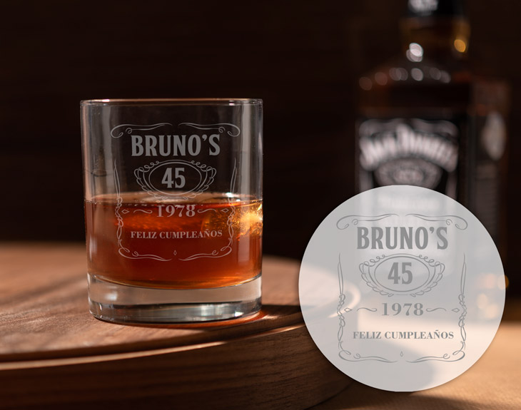Inspirado en el whisky más emblemático del mundo, el diseño de este vaso de whisky personalizado es perfecto para aquel amigo que no puede vivir sin su copita con hielos después de comer. Desde Tennessee, el Jack Daniel's inunda a todo el mundo con su especial manera de hacer whisky, aportando un sabor y aroma distintos a la bebida. Si tu amigo no para de repetirte lo mismo, este es un regalo original con el que va a alucinar. Capacidad: 31 cl. Altura aproximada: 9,5 cm.