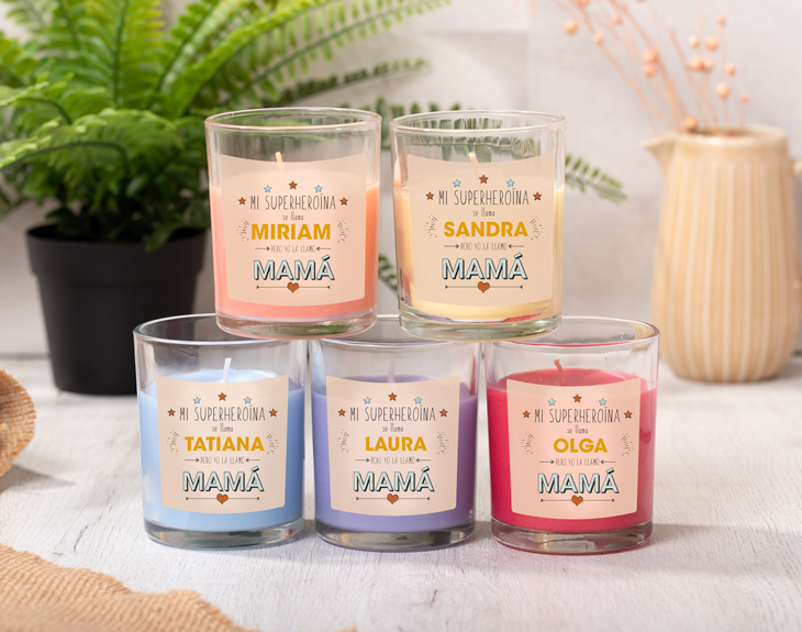 ¿Cuántas increíbles superheroínas conoces a lo largo de tu vida? Muchísimas chicas tienen como referentes a personajes como Wonder Woman, la Viuda Negra o la Bruja Escarlata, grandes mujeres que dedican su vida a salvar el mundo de la maldad y el poder de los míticos villanos de cómic. Sin embargo, nos estamos olvidando de la superheroína más importante: ¡tu madre! Puede que mamá no sea una espía rusa de sangre fría o una mujer capaz de volar y dar puñetazos brutales contra malvados villanos, pero eso no quita que sea una grandísima mujer. ¡Una madre se sacrifica incluso más que estas superheroínas! Por eso creemos que ha llegado el momento de decirle todo lo que la quieres con un producto tan emocionante como práctico: esta vela personalizada está hecha para las grandes heroínas de casa. Esta vela aromática para mamá viene en vaso y cuenta con una altura de 8 centímetros. Escoge el aroma que más le pueda gustar, y podrás personalizar el cristal del vaso con este diseño hecho especialmente para las mejores mamás. Solo tendrás que entrar en el área de personalización y escribir el nombre de tu superheroína en la plantilla del producto. ¡Nosotros nos encargaremos de crear una pegatina para crear este regalo original! Medidas: -Altura: 8 cm