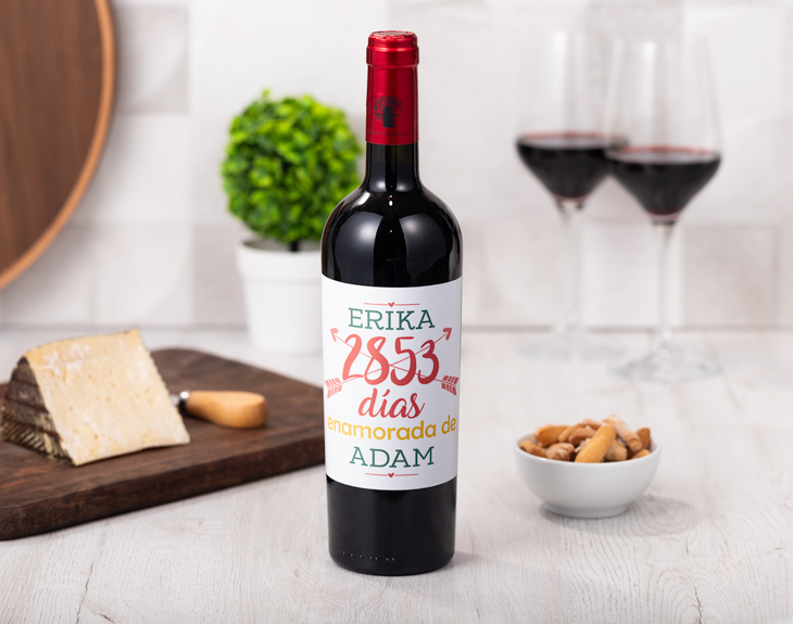 Para celebrar una fecha señalada con tu pareja, nada como esta bonita botella de vino con la etiqueta personalizada. En ella podrás mostrar cuantos días llevas sintiendo amor por esa persona especial. ¿No te parece romántico? Utilizamos como base un exquisito vino de la Tierra de Castilla y León, cuya Certificación de Origen asegura que es un producto de una calidad excepcional. Envejecido en barrica de roble, estamos ante un caldo sorprendente y lleno de matices, cuya botella premium y su elaborado sabor hacen de él el mejor regalo posible.