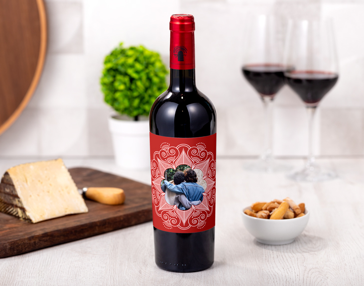 Botella de vino personalizada con un diseño inspirado en un mandala y en la fuerza del amor. Podrás poner esa foto especial en el centro de la etiqueta, para que sea el vino más especial y romántico del mundo. Utilizamos como base un exquisito vino de la Tierra de Castilla y León, cuya Certificación de Origen asegura que es un producto de una calidad excepcional. Envejecido en barrica de roble, estamos ante un caldo sorprendente y lleno de matices, cuya botella premium y su elaborado sabor hacen de él el mejor regalo posible.