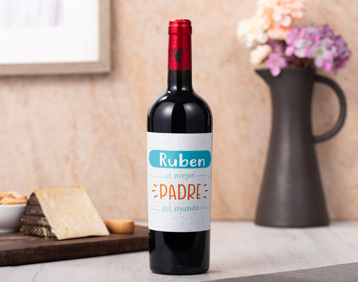 ¿Has tenido al mejor maestro que existe? Si gracias a los increíbles valores que te ha inculcado tu padre te has convertido en la gran persona que eres hoy, es el momento de agradecérselo de la manera más especial. ¿Y qué mejor que con un detalle así de original? Coincidimos en que regalar vino siempre es una buena opción, pero si encima es una botella personalizada con su nombre y la frase "El mejor padre del mundo", se convierte en el mejor regalo que puede existir. Así podréis disfrutar de unas buenas copitas de vino en familia y recordar los momentos más entrañables o divertidos que habéis vivido juntos. ¿No te parece un detalle genial?¡seguro que a tu padre se le salta incluso alguna lagrimita de emoción al verlo! Utilizamos como base un exquisito vino de la Tierra de Castilla y León, cuya Certificación de Origen asegura que es un producto de una calidad excepcional. Envejecido en barrica de roble, estamos ante un caldo sorprendente y lleno de matices, cuya botella premium y su elaborado sabor hacen de él el mejor regalo posible.