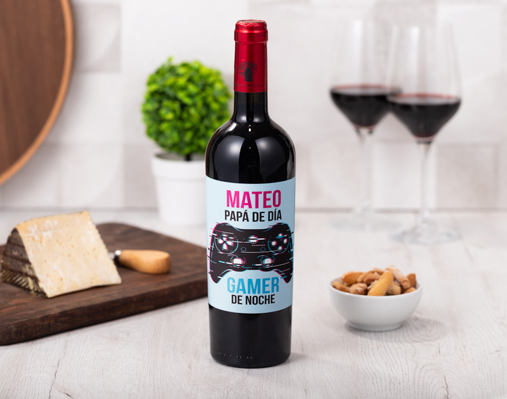 ¿Se te ocurre alguna manera de hacer que tu padre se sienta la persona más feliz del mundo?¡A nosotros sí! Si las tres pasiones de tu papá son los videojuegos, salir de vinos con amigos y disfrutar de tiempo en familia, este regalo original le hará muchísima ilusión. Solamente tienes que decirnos su nombre para que podamos personalizar el diseño y hacer que se sienta totalmente identificado. Y es que, no todo el mundo tiene la suerte de tener al mejor padre y al mejor gamer a la vez. ¡Seguro que está desando estrenar su regalo jugando una partida al Fortnite! Utilizamos como base un exquisito vino de la Tierra de Castilla y León, cuya Certificación de Origen asegura que es un producto de una calidad excepcional. Envejecido en barrica de roble, estamos ante un caldo sorprendente y lleno de matices, cuya botella premium y su elaborado sabor hacen de él el mejor regalo posible.que no sea esta!