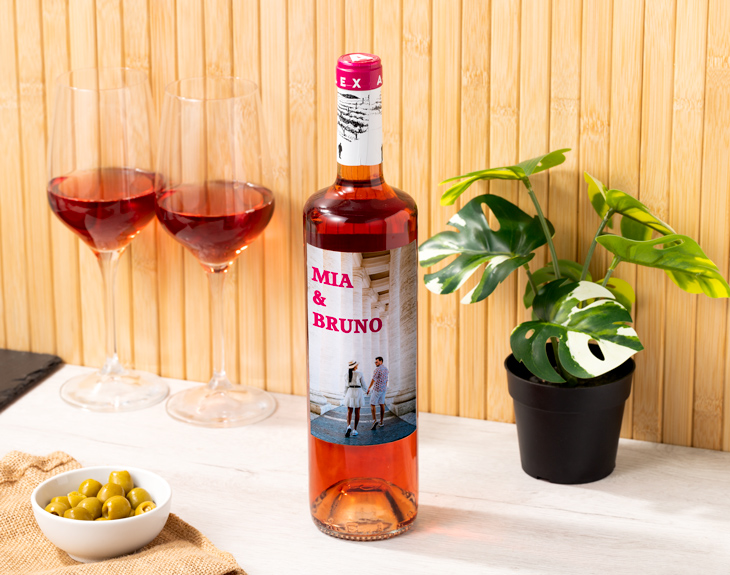 ¿Quién dice que en el mundo no hay hueco para los amantes del vino rosado? Si es tu caso (o el de esa persona especial a la que quieres sorprender), te recomendamos probar esta botella de vino rosado personalizada. Envíanos una foto, un texto o lo que quieras y te lo entregaremos con una etiqueta única e irrepetible. La base de este regalo es una botella de vino rosado Alex Garnacha. Perteneciente a la Denominación de Origen Navarra, es un caldo elaborado a partir de garnacha, la uva de moda. Fresco, sabroso y con un final muy persistente.