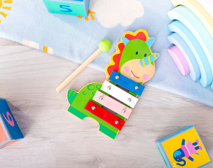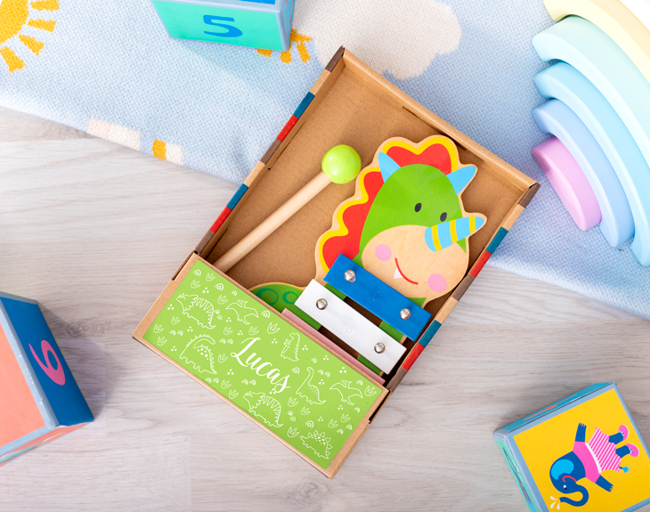 • Xilófono infantil personalizado con forma de dragón. • Tarjeta Recordatoria.