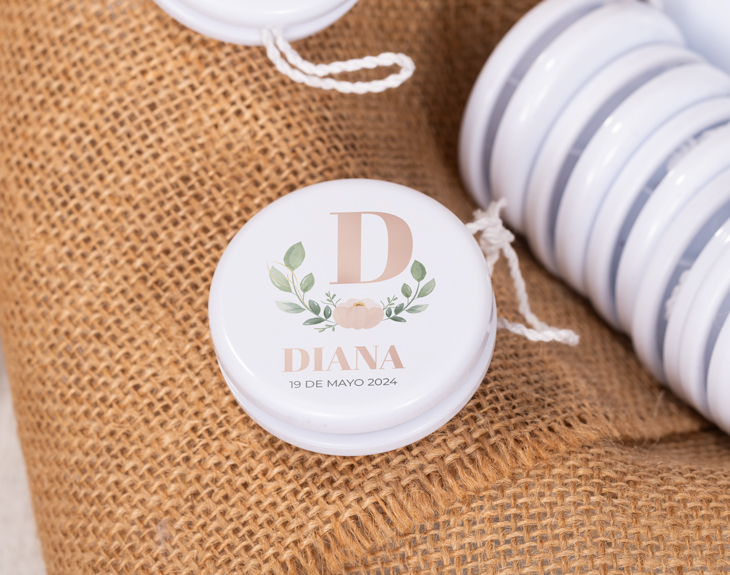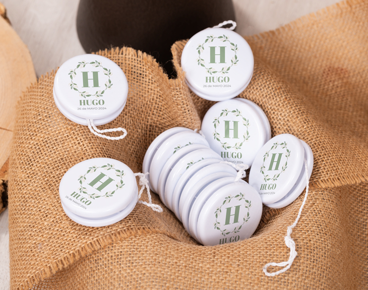 Con la llegada de la Primera Comunión de tu hijo/a también llegan las reuniones familiares. ¿No tendríamos que celebrarlo de una forma única y especial? Por eso contamos con este yo-yo personalizado, un producto hecho para que todo el mundo pueda pasar un buen rato. ¡Un yo-yo de color blanco hecho para todos los públicos! Y es que este yo-yo con diseño de comuniones está pensado para sorprender a los invitados en este día tan señalado para toda la familia. El yo-yo cuenta con un diámetro de 5 centímetros y un grosor de 1,5 centímetros, por lo que siempre lo podrán llevar en el bolsillo... ¡Y recordar el día de la Primera Comunión de tu hijo! Un regalo original para Primera Comunión como este será la clave para sacarles una sonrisa a todos tus invitados. Podrás personalizarlo con el diseño de inicial que quieras entre los dos estilos disponibles. Solo tendrás que escoger el número de yo-yós que quieras y añadirlos al carrito. Después entra en el área de personalización para diseñarlo de la forma que quieras. ¡Clica sobre cada cuadro de texto para escribir lo que quieras! Medidas: 8 centímetros de diámetro. • Consulte precio por cantidades.