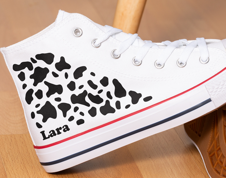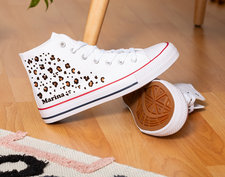 Estas zapatillas personalizadas son el accesorio perfecto para las personas amantes del estampado 'animal print'. Saca tu lado más salvaje con este calzado tan chulo y elige con que diseño te quedas: vaca o leopardo. Además de ser las mejores zapatillas del mundo, son súper cómodas y te irán genial con tus prendas favoritas. ¡Son ideales! Si se acerca un cumple, el amigo invisible, un aniversario o cualquier otra fecha especial, no dudes que con estas originales zapatillas triunfarás siempre. Es un regalo único y muy divertido que conquistará el corazón de quien lo reciba. Y como sabemos que los gustos son diferentes, podrás elegir si quieres las zapatillas de color blanco o negro y también la talla, ya que tenemos para los más pequeños y para adultos. Si te estás preguntando cómo puedes personalizar estas zapatillas altas, es muy sencillo. Cuando entres en el área de personalización, lo único que tienes que hacer es elegir el diseño que más te guste y completarlo con el nombre que quieras, así de fácil. Nosotros nos encargamos de que quede perfecto y listo para regalar. ¡Es un regalazo! Importante: se personaliza con el mismo diseño la cara externa de cada zapatilla. Importante: la guía de tallas indica el tamaño de la suela.