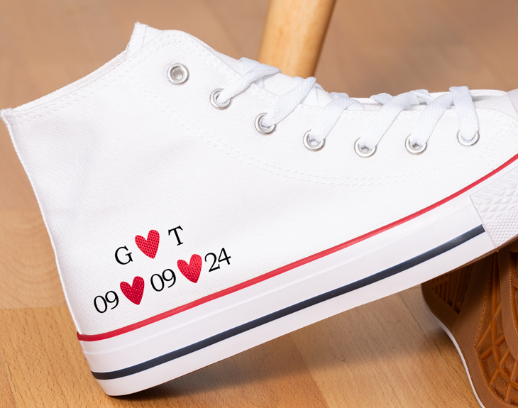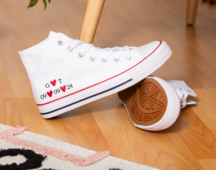 ¡Tenemos las zapatillas más románticas del mundo! Si buscas sorprender a tu pareja con un detalle único, nuestras zapatillas personalizadas con diseño "Fecha especial" son ideales para regalar por un aniversario, San Valentín, un cumpleaños o por cualquier ocasión especial. Además, lo mejor de estas zapatillas altas es que son personalizables, podrás escribir vuestras iniciales y añadir la fecha más especial para vosotros. ¡Son geniales! Imagina la ilusión que le hará recibir a tu pareja estas zapatillas tan bonitas, sin duda, se convertirán en su calzado favorito, le encantarán. Personalizar estas zapatillas es muy sencillo. El primer paso a seguir consiste en añadir el producto al carrito y entrar al área de personalización. Una vez ahí, ya puedes escribir las iniciales junto a la fecha más especial. Pronto estarán perfectas y listas para regalar. ¡Será un original regalo para parejas! Importante: se personaliza con el mismo diseño la cara externa de cada zapatilla. Importante: la guía de tallas indica el tamaño de la suela.