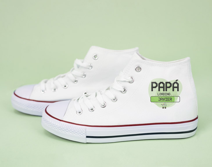 Convertirse en padre es todo un reto y un camino lleno de ilusión y alegría. Estamos acostumbrados a regalar cosas al bebé una vez que ha nacido, pero, ¿qué hay de los papis? Si este pensamiento ha cruzado tu mente alguna vez estas zapatillas personalizadas son ideales para regalar a ese amigo que está a punto de ser papá y le hará muchísima ilusión recibirlo. El diseño de estas zapatillas tiene temática de videojuegos, por lo tanto si a la persona a la que se lo quieres regalar también es fan le fliparán. Conseguir estas zapatillas es súper sencillo: están disponibles en blanco y en varias tallas. Cuando las añadas al carrito te saldrá la opción de personalizar donde podrás indicarnos el nombre que quieres que aparezca y podrás ver una previsualización de como queda ese nombre con nuestro diseño. Sorprende a ese conocido que está en proceso de ser padre, hazle más amena la llegada de su hijo y que pueda demostrar que dentro de muy poquito será el padrazo del año con este increíble calzado. Importante: se personaliza con el mismo diseño la cara externa de cada zapatilla.