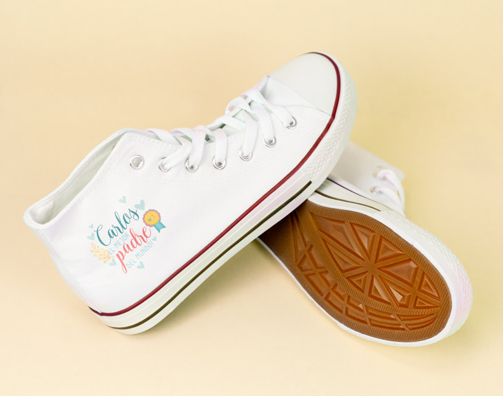 Nuestros papás son una parte fundamental de nuestra vida y hacen un trabajazo en enseñarnos cosas nuevas e importantes. Seguro que recuerdas alguna ocasión en la que tu padre te ha sacado de algún apuro, te ha ayudado a hacer los deberes de matemáticas o te ha llevado en la parte trasera de su bici. Es importante ser detallista con las personas que queremos incluso aunque no sea un día especial para esa persona, los detalles imprevistos hacen muchísima más ilusión. ¿Y qué mejor para recordarle a tu papi que le quieres que unas zapatillas personalizadas con un mensaje de premio a mejor padre del mundo? Seguro que le encanta y no se las quita ni un sólo día. Se las mostrará con ilusión a todos sus amigos, compañeros de trabajo y gente de su círculo. Nuestros botines están disponibles en blanco y negro y en varias tallas y si quieres este modelo es súper sencillo. Una vez añadas el producto al carrito te saldrá la opción de personalizarlo, ahí podrás agregar el nombre de tu padre y ver como queda antes de finalizar el pedido. Así podrás hacerte una idea del resultado final. Importante: se personaliza con el mismo diseño la cara externa de cada zapatilla. Importante: la guía de tallas indica el tamaño de la suela.